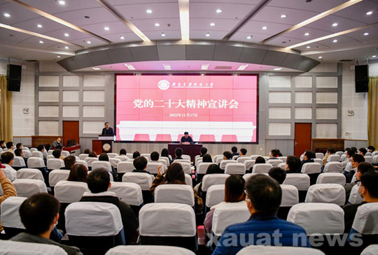 为进一步推动党的二十大精神学深悟透、入脑入心,11月17日上午,校党委书记朱晓渭在雁塔校区工科楼一楼报告厅作题为“深入学习宣传贯彻党的二十大精神努力培养堪当民族复兴大任的时代新人”的宣讲报告。宣讲会以线上线下结合方式举行,青年教师、研究生、本科生党员代表等600余名师生通过不同形式参加了此次学习。