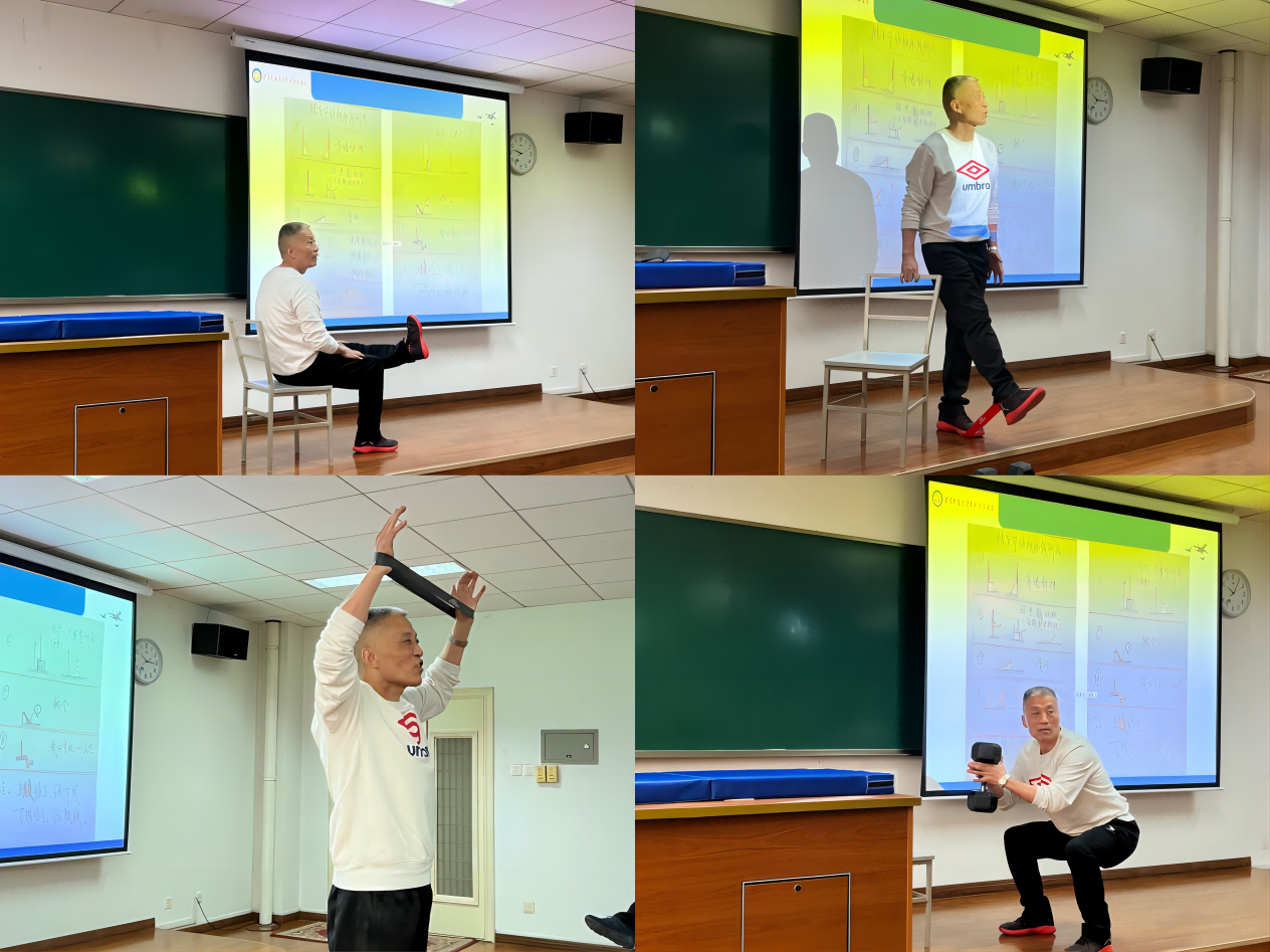 讲座中,吴教授以康复训练手绘图为切入点,运用桌椅、弹力带、哑铃等运动器械生动形象地为学院全体师生讲授了常见运动伤病的运动康复动作和方法。