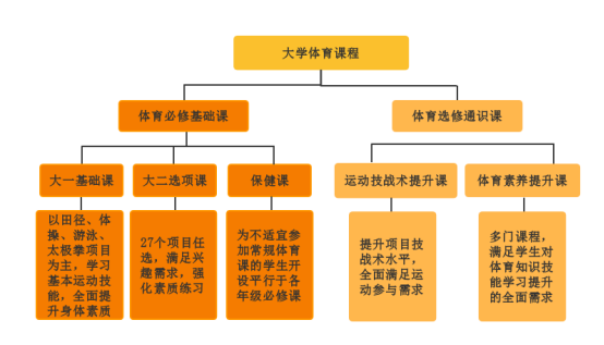 (1)大一必修基础课。大学体育一、二以行政班为单位授课,两学期授课班不变,无需进行选课。