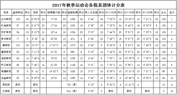 经过激烈的角逐,在一片欢乐的氛围中,秋季趣味运动会圆满落幕。最后,土木学院以总分162的成绩获得团体总分第一名,机电学院以150分获得团体总分第二名,材矿学院以138分获得团体总分第三名。