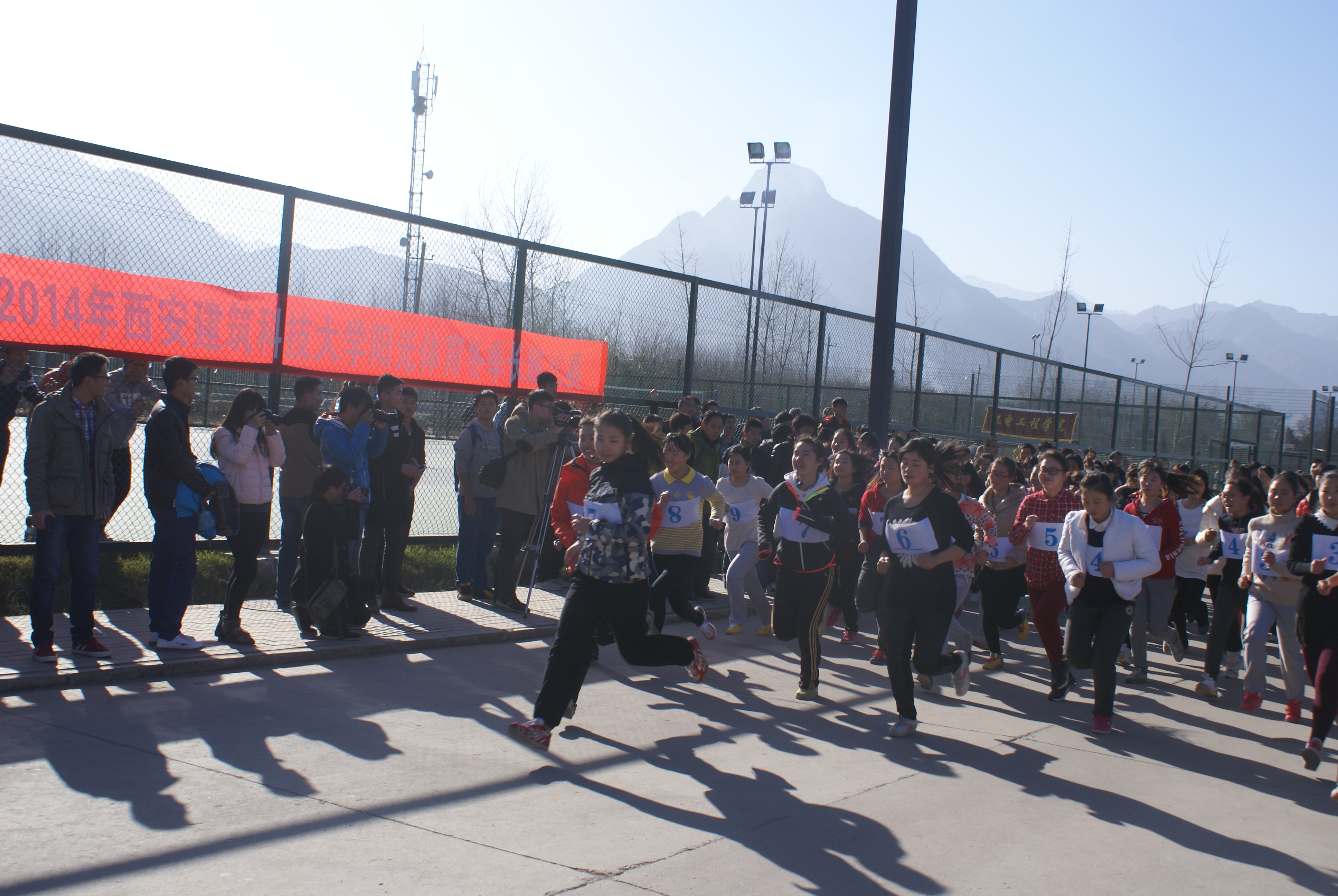和上午的比赛相比,下午的比赛更为精彩、激烈。运动员被分为六组,按照事先划定的路线,从篮球场出发,绕过学府城,直奔田径场。冬日的草堂校区阳光明媚,巍峨的秦岭山下,建大学子尽情释放着青春的热情。
