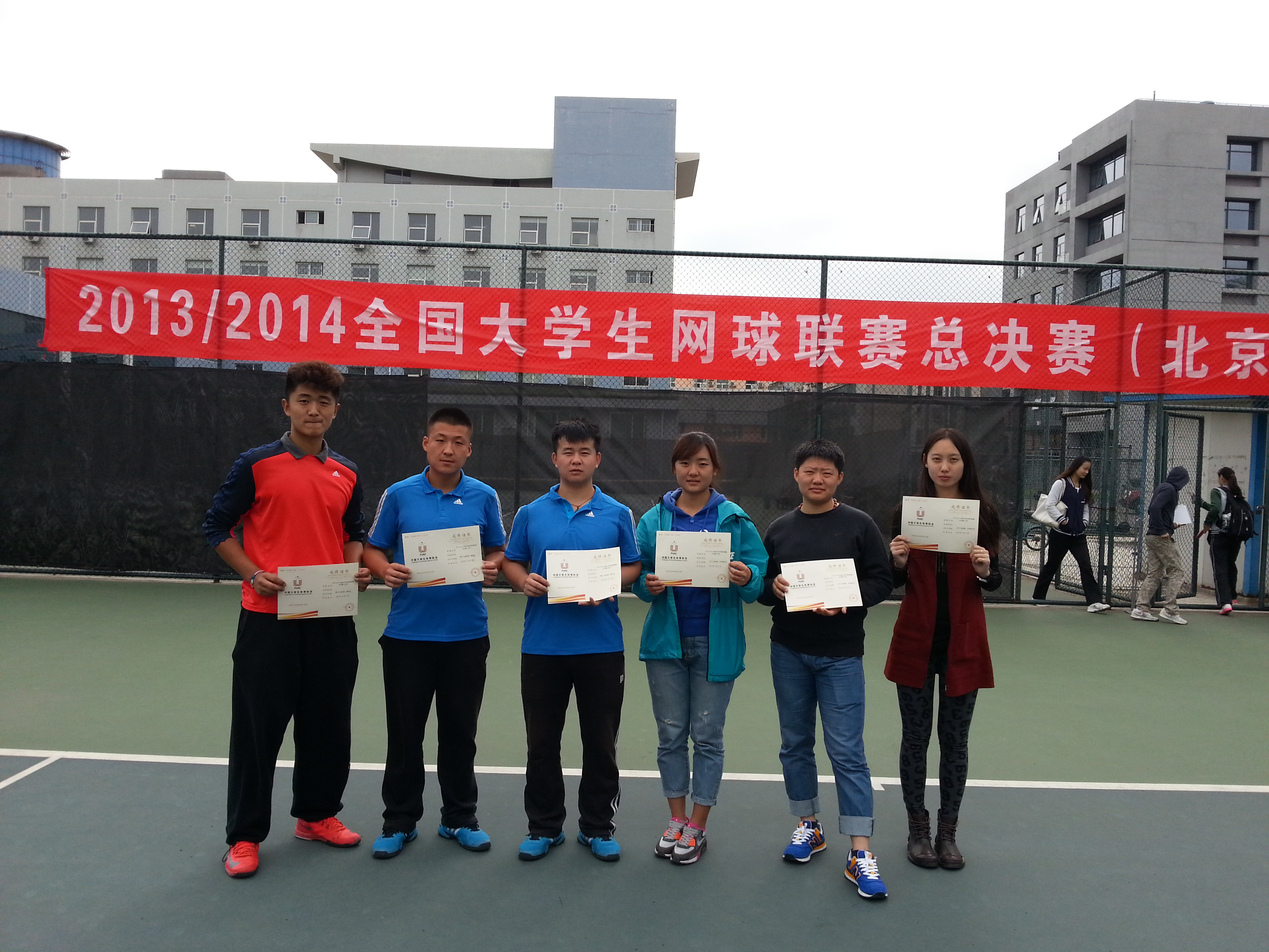 2014年10月12日,为期两天的2013-2014年度全国大学生网球联赛总决赛在清华大学、中国人民大学、北京交通大学3个赛场同时落下帷幕,此次进京参赛的共有43所大学,我校网球队在教练张德智、于南得老师的带领下,经过10月11日、12日两天的奋勇拼搏,男子乙组和女子乙组均取得了团体第五名的好成绩。