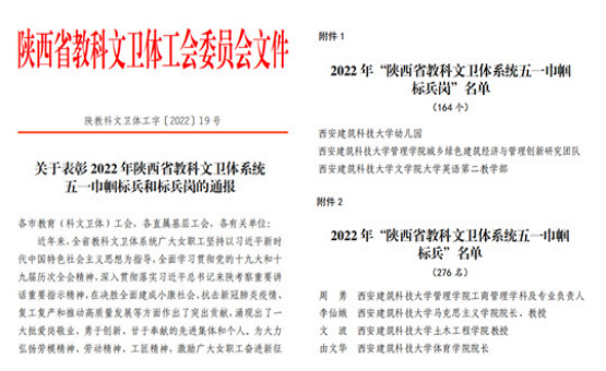 在“五一”劳动节到来之际,陕西省教科文卫体工会对全省系统内优秀女职工团体和个人进行了表彰,我校附属幼儿园、管理学院城乡绿色建筑经济与管理创新研究团队、文学院大学英语第二教学部获“陕西省教科文卫体系统五一巾帼标兵岗”荣誉称号,管理学院周勇、马克思主义学院李仙娥、土木工程学院文波、雷竞技RAYBET由文华四位教师获“陕西省教科文卫体系统五一巾帼标兵”荣誉称号。