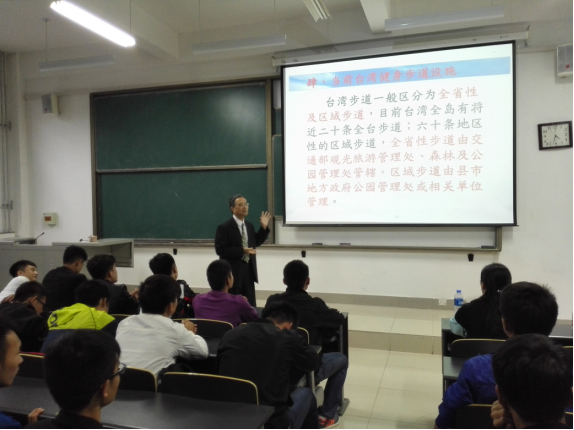 2016年9月20日下午,台湾体育运动史学会会长、东北亚体育运动史学会副会长、台湾高雄市树德科技大学王建台教授再次应邀来到我校草堂校区,在学府城9-303教室作了题为“台湾全民健身工程与健身步道施设”的专题讲座, 体育系百余名师生聆听了此次学术报告。报告由体育系主任由文华教授主持。