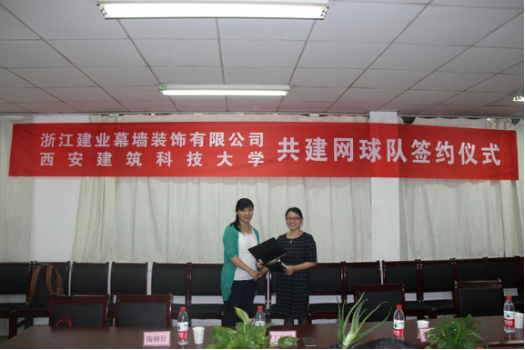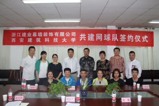 接着,浙江建业幕墙装饰有限公司总经理助理陶柳珍与我校体育系主任由文华代表双方在协议书上签字并冠名“西建大墅标网球队”。浙江省建筑金属管制品管理协会秘书长、莫干山联盟秘书长张旭在寄语中希望通过网球运动搭起学校与企业之间互动的桥梁,不断推动企业文化与校园文化的融合共生,此次合作将成为一个良好的起点,今后企业会更加关注关心学校的发展,加大合作力度,以达到双赢。最后,体育系主任由文华在总结中提到,网球队将致力于丰富企业文化内涵,为企业体育文化活动的开展作出积极贡献,并希望能进一步扩大校企合作的范围,使之结出更多的硕果。同时祝愿浙江建业幕墙装饰有限公司蒸蒸日上、欣欣向荣,相信在浙江建业幕墙装饰有限公司的大力支持下,我校网球队将会获得进一步的发展。