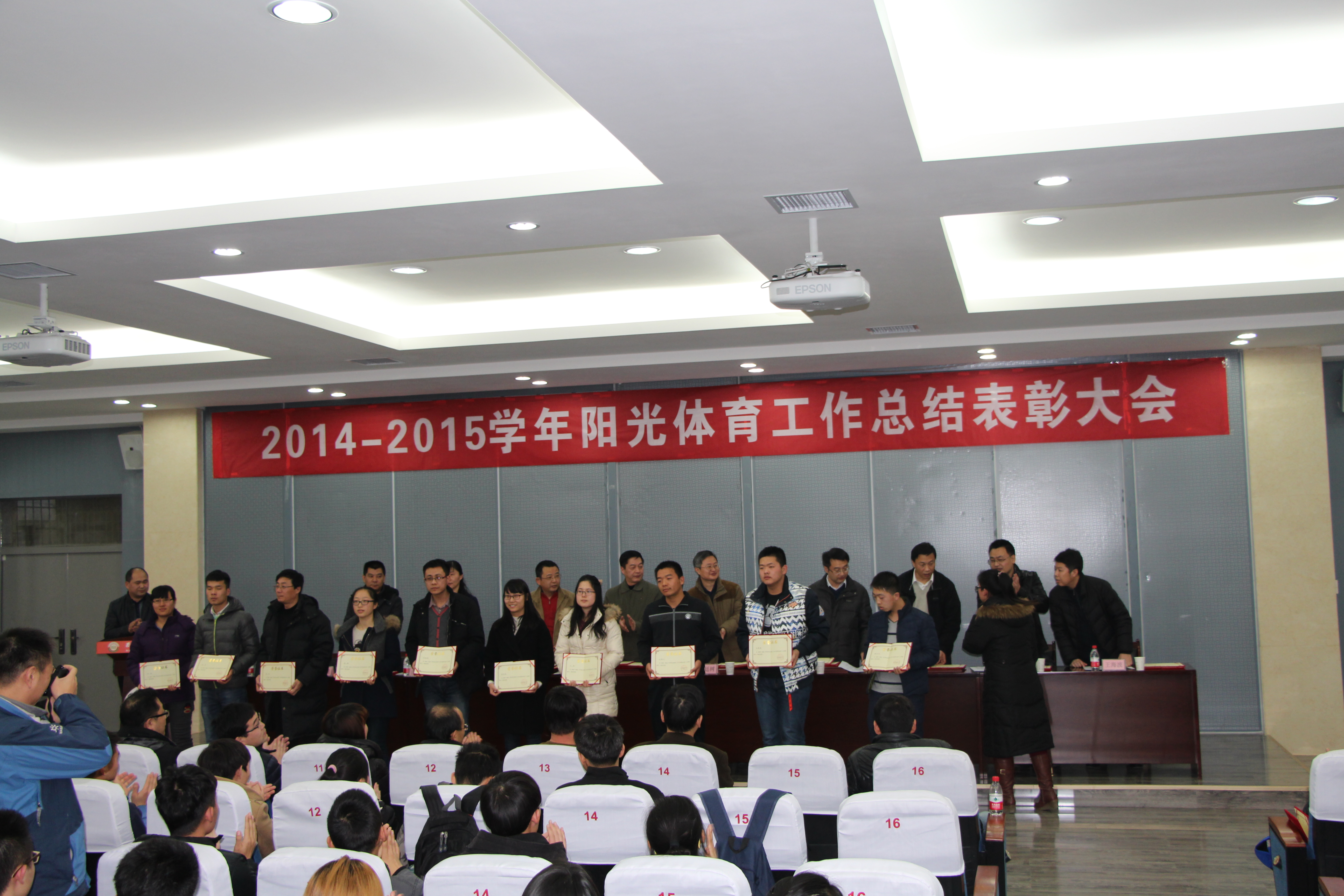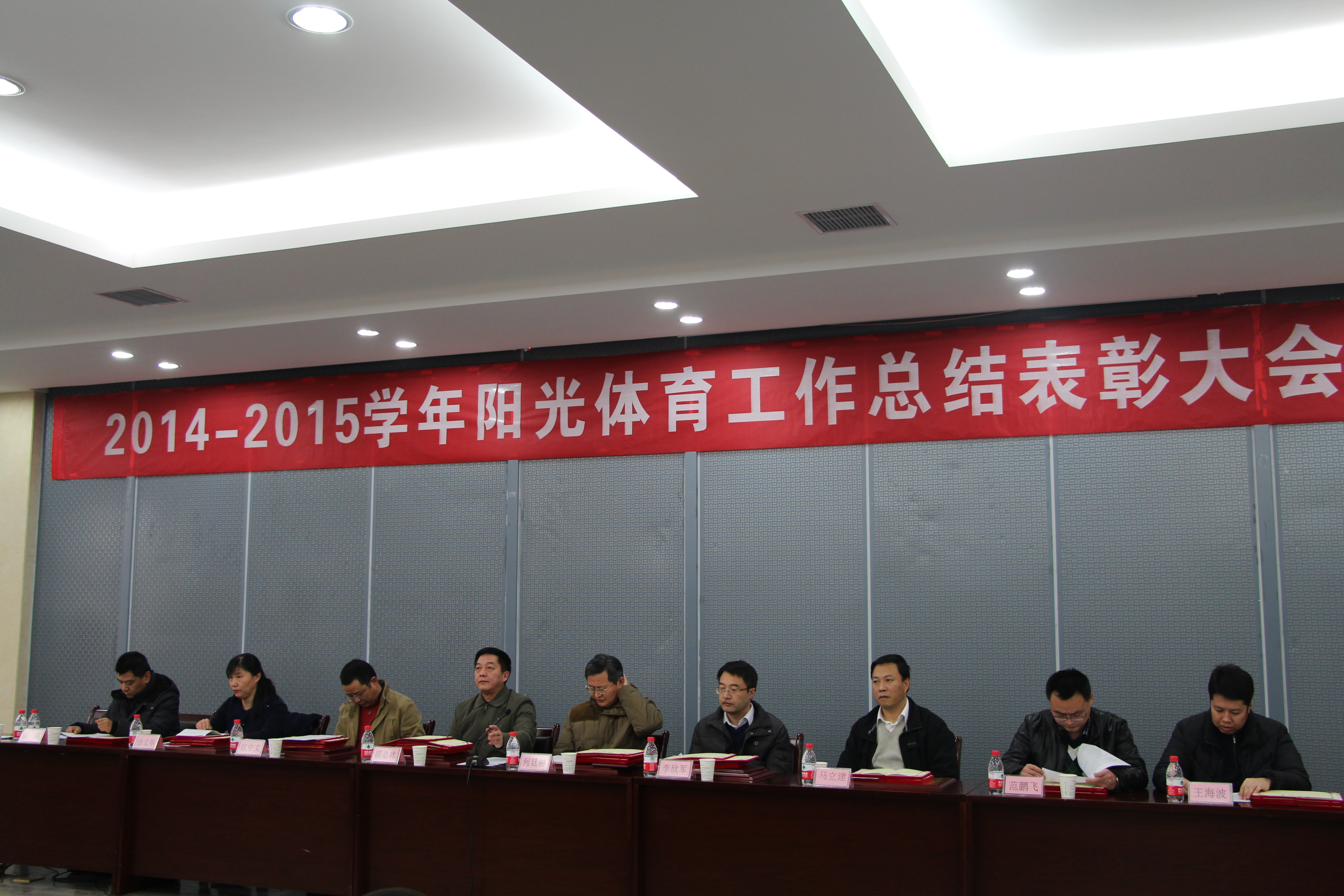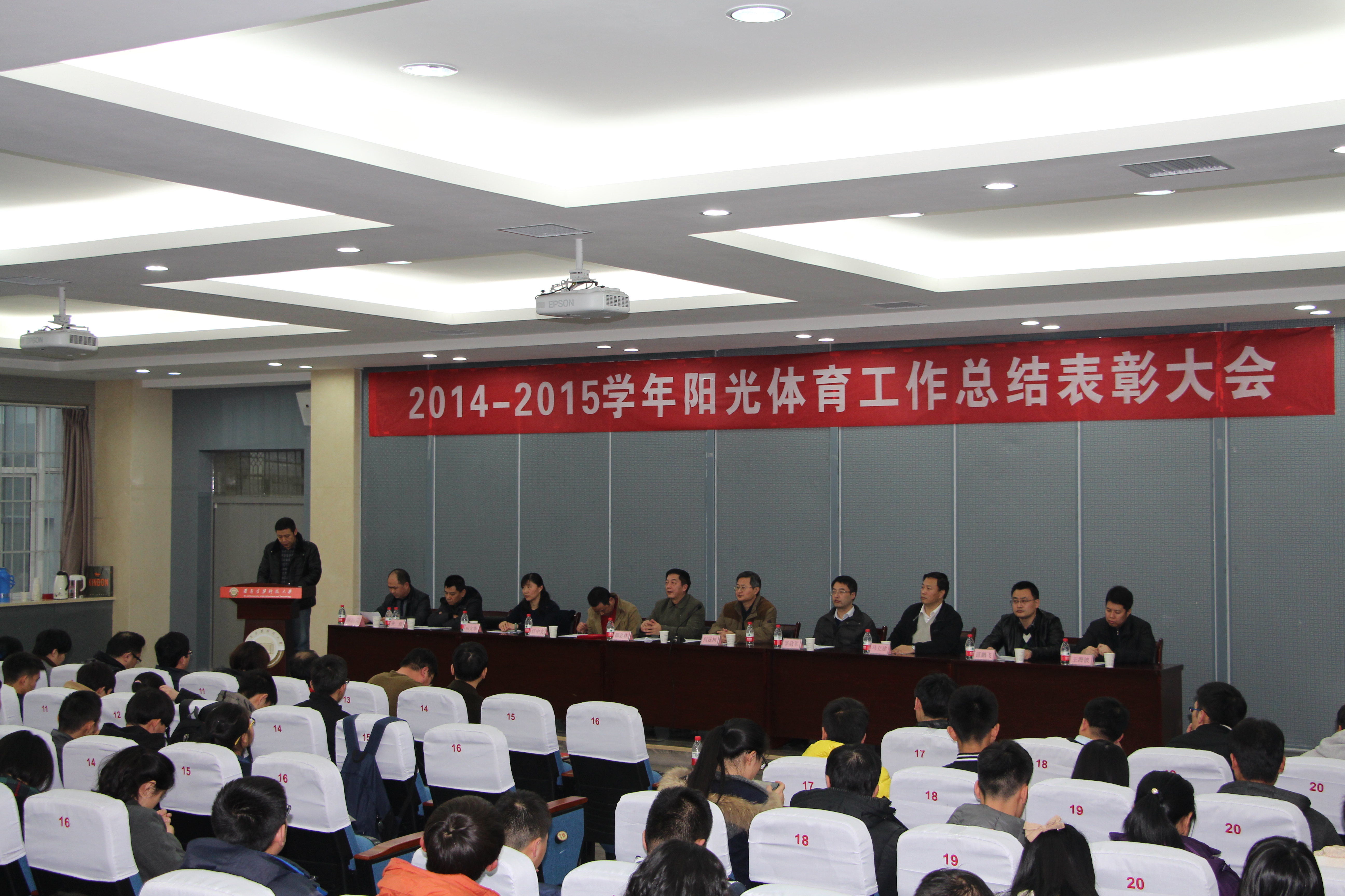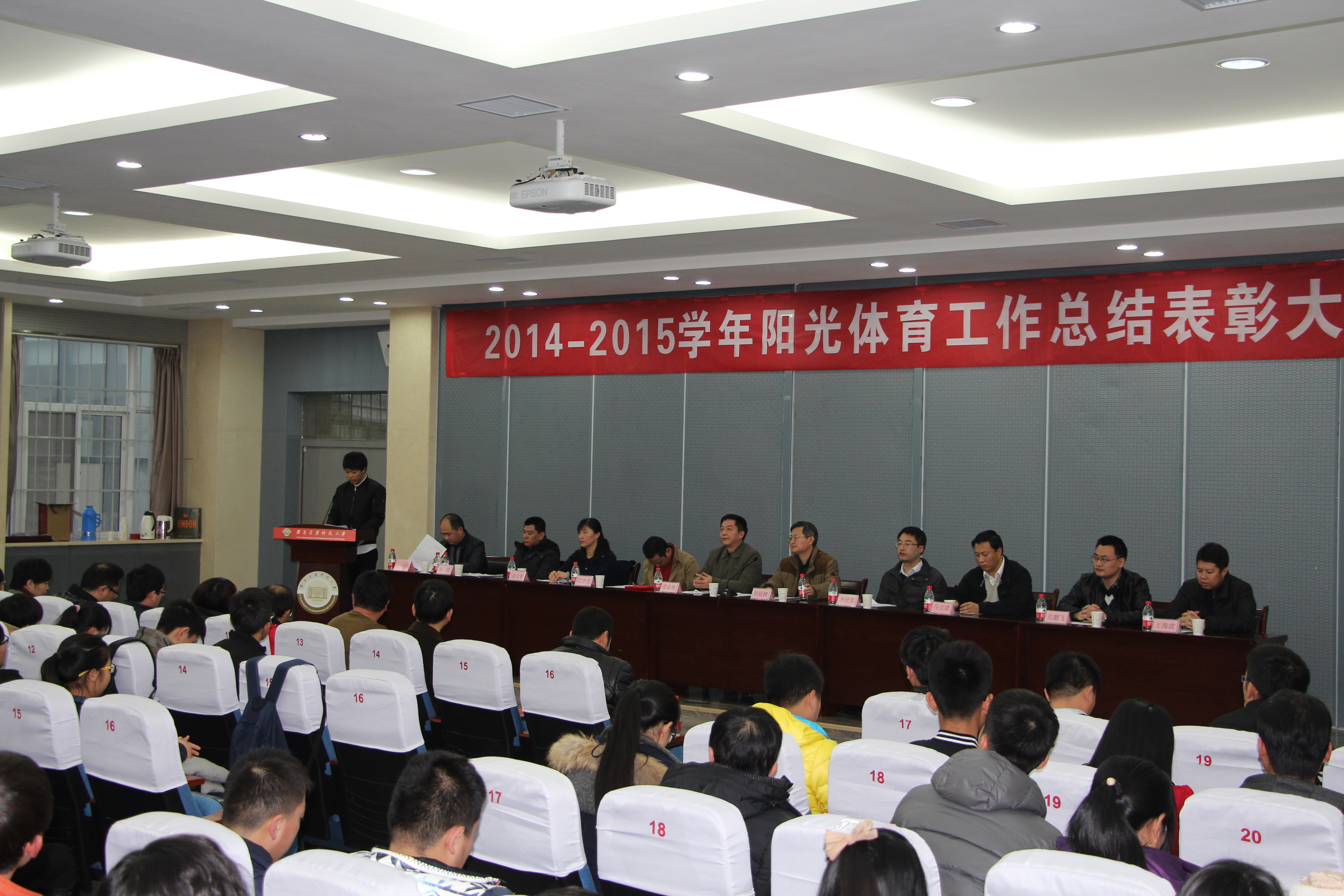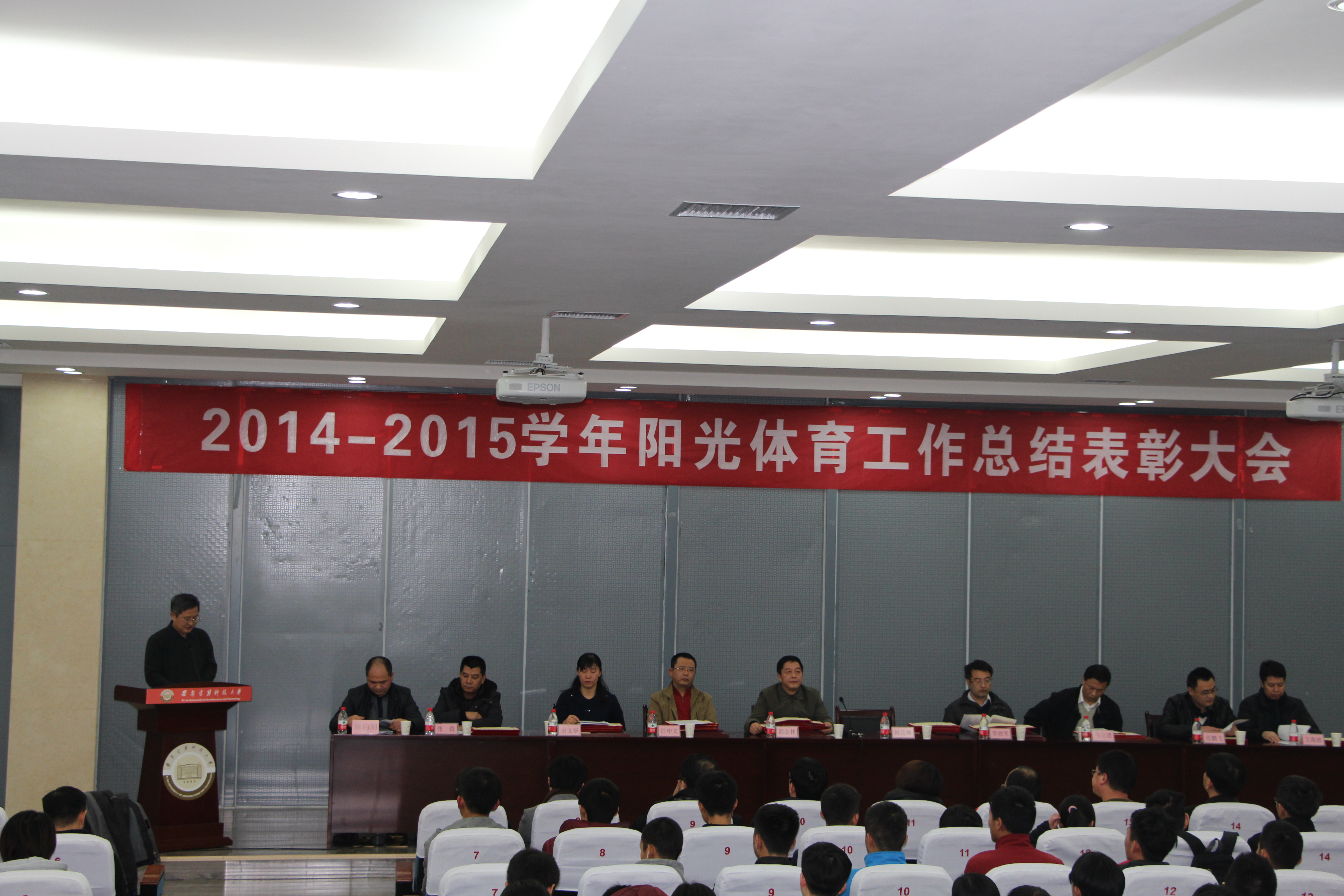 2015年12月17日下午,雷竞技平台2014-2015学年阳光体育工作总结表彰大会隆重召开。我校主管体育工作副校长邵必林出席本次表彰大会,出席本次大会的还有体育系主任由文华、教务处处长何廷树、校团委书记陈向阳、校办李欣军、校工会副主席江中文华清学院马立建、学工部副部长范鹏飞、研究生院副院长王海波、草堂管委会副主任张昱以及体育工作委员会的全体委员、获奖代表、全体辅导员和来自各个院(系)的200余名学生代表参加大会,大会由校团委书记陈向阳主持。
