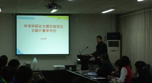 在报告中,许治平教授详细讲解了体育科研论文的选题原则和基本思路,介绍了论文的题目、摘要、关键词等撰写的要求,阐述了引用文献的技巧和方法,提出参考文献应该以书籍为主,以近5年发表的期刊为宜。随后,许治平教授和教师们进行了互动交流,并提出了如何捕捉体育学科研究的热点问题,以及结合我校专业特色的选题问题,使在场教师深受启发。
