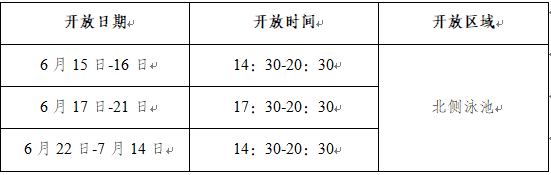 为满足校内师生课余游泳锻炼需求,结合游泳教学安排及天气、水温等情况,经研究决定,自2024年6月15日起面向学校内部开放,具体安排如下: