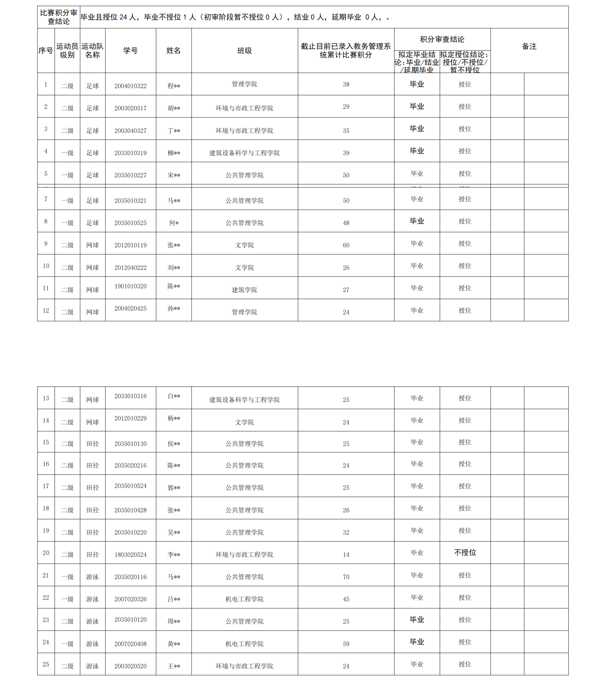 现对本科毕业生中高水平运动员比赛积分与毕业及授位情况进行公示,公示自2024年6月19日16:00至2024年6月21日16:00。公示期对审核结果有异议,请将书面材料交至雷竞技RAYBET雁塔校区文体馆102办公室。