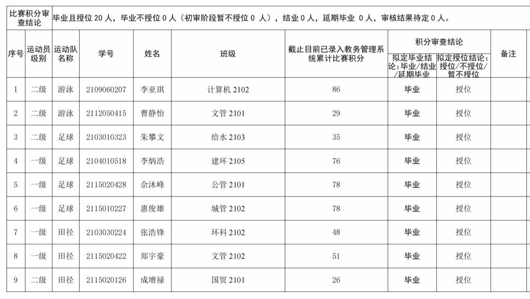 现对本科毕业生中高水平运动员比赛积分与毕业及授位情况进行公示,公示自2025年6月19日16:00至2025年6月21日16:00。公示期对审核结果有异议,请将书面材料交至雷竞技RAYBET雁塔校区文体馆204办公室。
