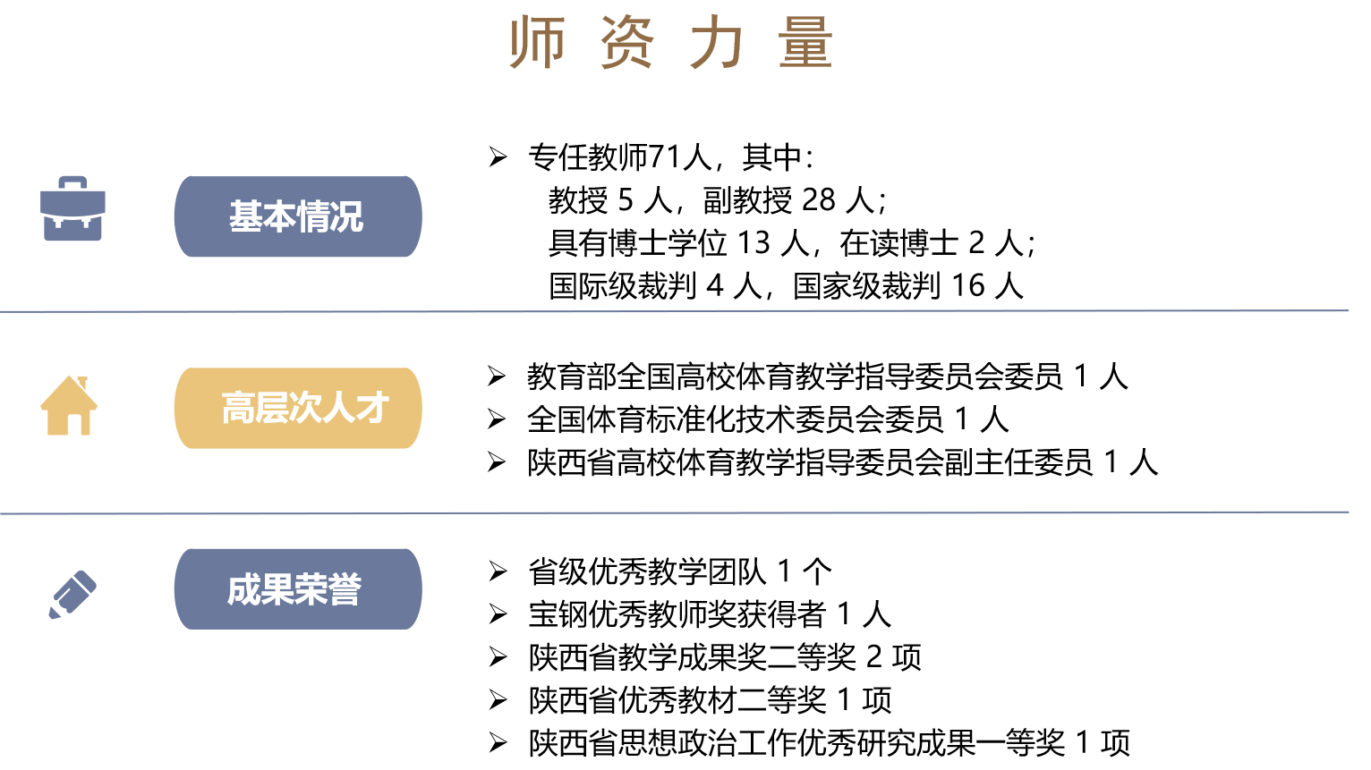 雷竞技RAYBET现有教职工86人,其中,专职教师71人,专职教师中,教授5人,副教授28人;国际级裁判4人,国家级裁判16人,教育部全国高校体育教学指导委员会委员1人,全国体育标准化技术委员会委员1人,陕西省高校体育教学指导委员会副主任委员1人。
