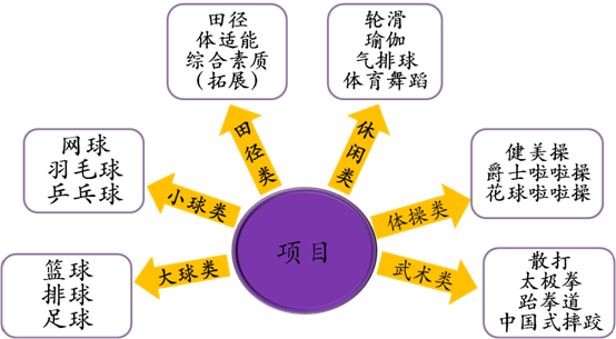 我校大学体育开设课程项目有:篮球、足球、排球、网球、羽毛球、乒乓球、健美操、啦啦操、田径、太极拳、散打、跆拳道、体适能、轮滑、综合素质(拓展)、气排球、体育舞蹈、瑜伽等18个项目。